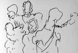 Er zat niets anders op dan wat snelschetsen te maken van wat ik beneden kon zien. Het openlucht restaurantje en bar waren zeer populair bij de plaatselijke bevolking en toeristen allerlei en het geroezemoes was soms oorverdovend.