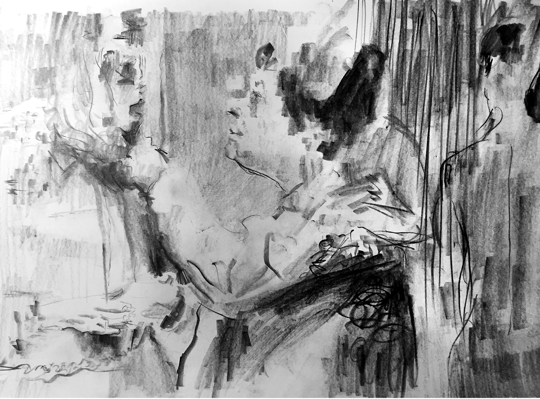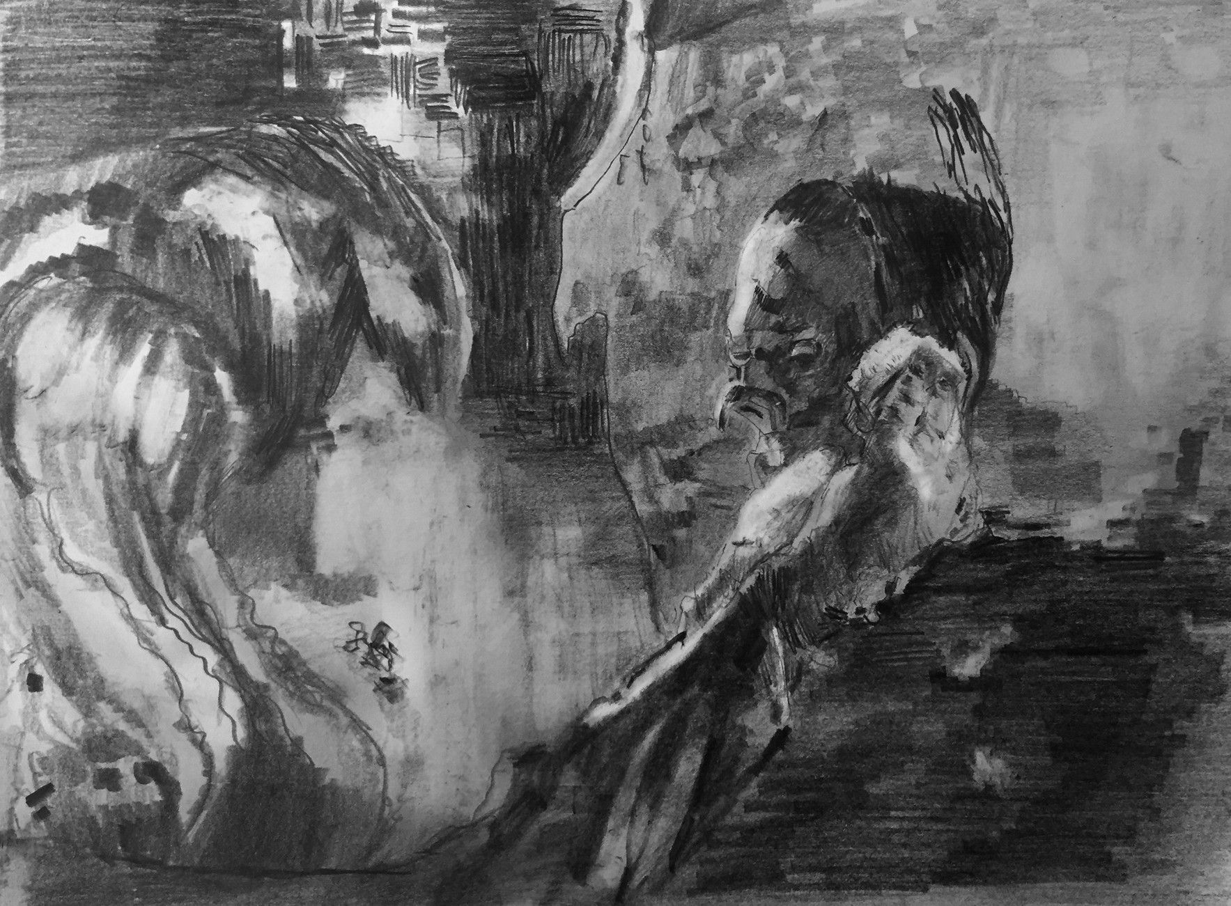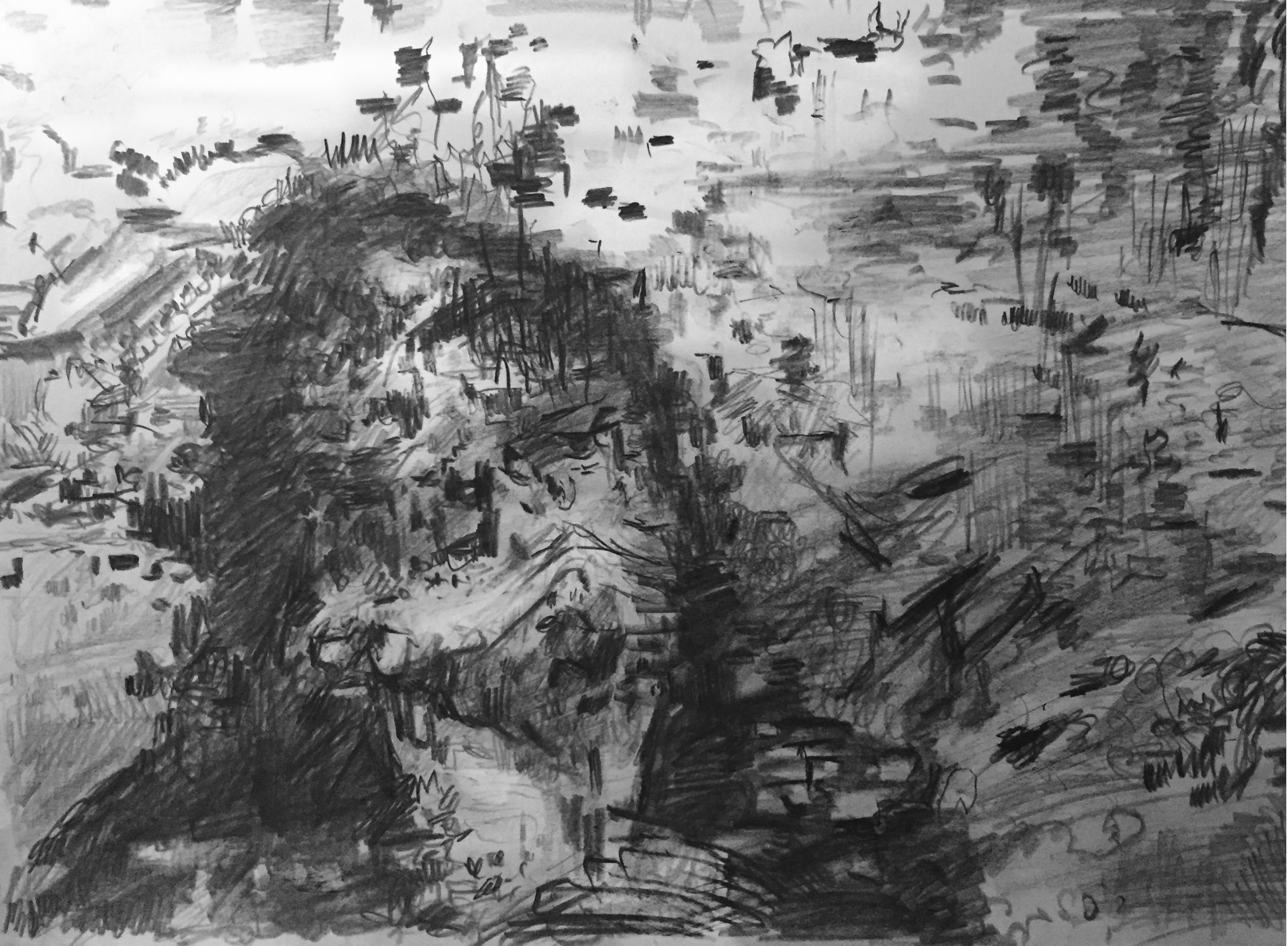 A series of pencil (6B) studies based on 'data moshed' video screenshots.