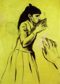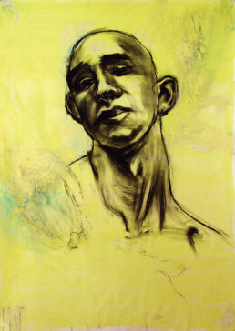 Ces images n’ont pas besoin de mots.Ce sont des portraits d’hommes et de femmes peints durant deux ans sous la lumière particulière de cette ville-ci, Lisboa, et les émotions, sensations, projections qu’elle a provoqué chez ce peintre du Nord, de jour, de nuit, au quotidien.Prodigieusement, par effet de transparence, association ou superposition d’idées, par la couleur qui les enveloppe, ces portraits nous semblent familiers…ils rappellent des situations ou des sentiments vécus, des silhouettes et des regards connus, des pensées ébauchées : un livre oublié, la victoire du club, une femme à la TV, un article du journal, la tête de X quand il a bu.Il y apparaît comme l’imbrication de pensées dont nous pourrions deviner le fil, les couches et le remous grâce à ces quelques fragments sauvés du naufrage irréversible de la mémoire exacte : le voisinage, un visage, les couleurs d’une rue ou d’un jardin, l’iconographie ambiante et collective, un sentiment de mouvance générationnelle puissante.C’est toute la force qu’acquiert la vision du peintre quand il est artiste véritable, acceptant de se soumettre à la réalité particulière de la ville aimée :nécessairement inclu à ses espaces habités et ses rites imposés, il cherche, esquisse et compose en les arpentant les axes et les contours d’une géographie culturelle unique autour du Tejo, au 21ème siècle.