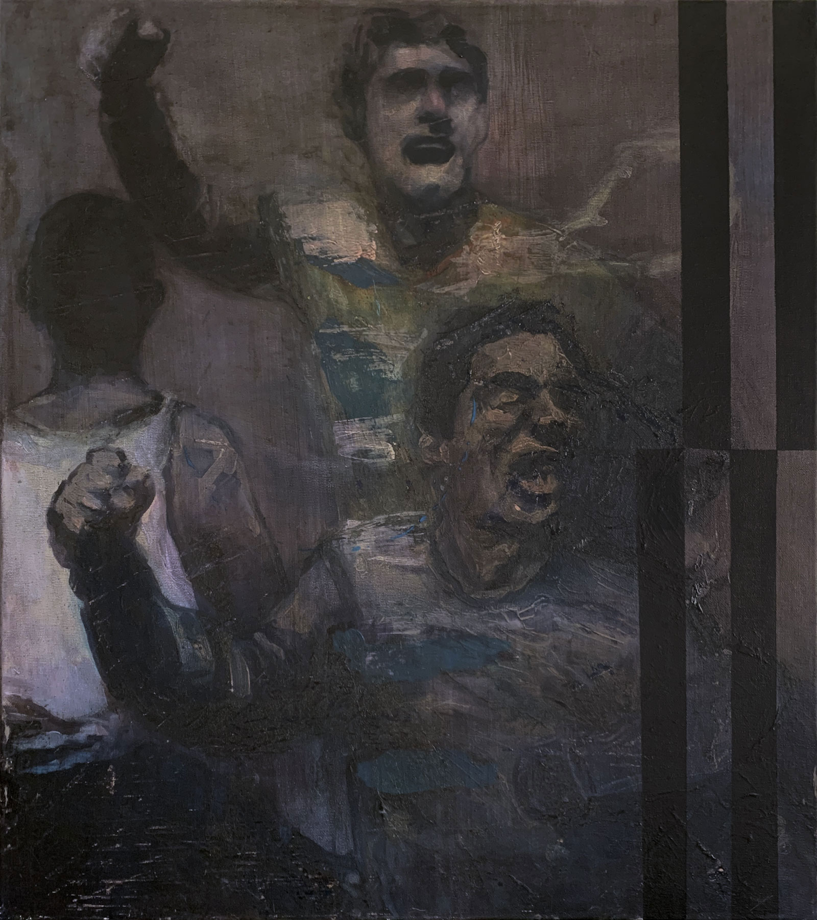 Ces images n’ont pas besoin de mots.Ce sont des portraits d’hommes et de femmes peints durant deux ans sous la lumière particulière de cette ville-ci, Lisboa, et les émotions, sensations, projections qu’elle a provoqué chez ce peintre du Nord, de jour, de nuit, au quotidien.Prodigieusement, par effet de transparence, association ou superposition d’idées, par la couleur qui les enveloppe, ces portraits nous semblent familiers…ils rappellent des situations ou des sentiments vécus, des silhouettes et des regards connus, des pensées ébauchées : un livre oublié, la victoire du club, une femme à la TV, un article du journal, la tête de X quand il a bu.Il y apparaît comme l’imbrication de pensées dont nous pourrions deviner le fil, les couches et le remous grâce à ces quelques fragments sauvés du naufrage irréversible de la mémoire exacte : le voisinage, un visage, les couleurs d’une rue ou d’un jardin, l’iconographie ambiante et collective, un sentiment de mouvance générationnelle puissante.C’est toute la force qu’acquiert la vision du peintre quand il est artiste véritable, acceptant de se soumettre à la réalité particulière de la ville aimée :nécessairement inclu à ses espaces habités et ses rites imposés, il cherche, esquisse et compose en les arpentant les axes et les contours d’une géographie culturelle unique autour du Tejo, au 21ème siècle.