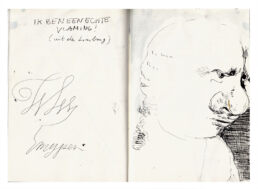Before Pettibon, Philip Guston already used this particular style, at least in his later period from the sixties and seventies. He uses a more naive, broader stroke to depict cartoonish figures. They often look like members of the clan (Conspirators), but he also paints cigarette butts, light bulbs, shoes, and other more common objects. He uses “We are image-makers and image-ridden” as his new motto. Meaning that he was fed up with the so-called ‘purity’ of abstract painting. The notion that painting – or every art for that matter – only exists for itself, that there is no other meaning for existence necessary or even possible. Guston, after working with abstract expressionism for decades, disagreed and wanted to make, draw and paint images from life. Above all, he wanted to tell stories.